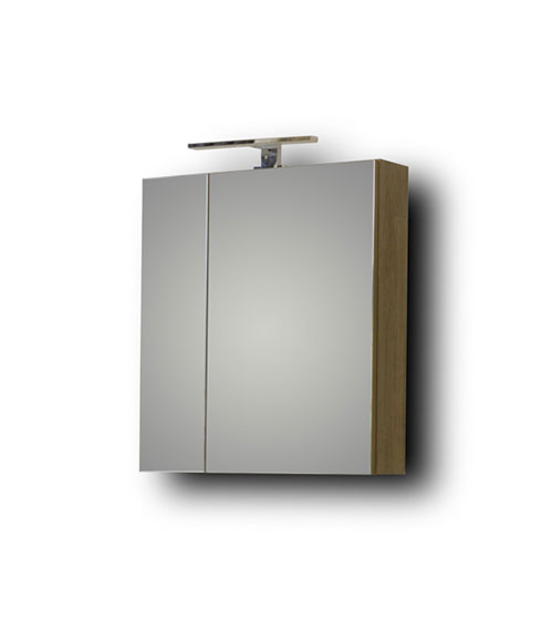 Καθρέφτης OMEGA GREY OAK 60. Περιλαμβάνει πρόσοψη καθρέφτη με δύο πόρτες και ένα χώρους αποθήκευσης για την τοποθέτηση αντικειμένων καθημερινής χρήσης. Συνδυάζεται με φωτιστικό LED 5 Watt IP44, το οποίο αντιστοιχεί σε λάμπα πυρακτώσεως 60 Watt.