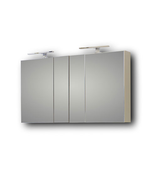 Καθρέφτης OMEGA WHITE 120. Πρόσοψη καθρέφτη με τέσσερις πόρτες και δύο χώρους αποθήκευσης για την τοποθέτηση αντικειμένων καθημερινής χρήσης. Συνδυάζεται με φωτιστικό LED 5 Watt IP44, το οποίο αντιστοιχεί σε λάμπα πυρακτώσεως 60 Watt.