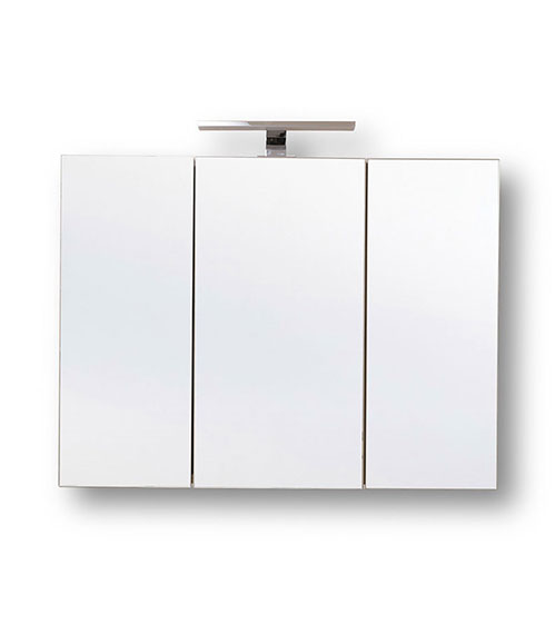 Καθρέφτης OMEGA WHITE 90. Πρόσοψη καθρέφτη με τρεις πόρτες και δύο χώρους αποθήκευσης για την τοποθέτηση αντικειμένων καθημερινής χρήσης. Συνδυάζεται με φωτιστικό LED 5 Watt IP44, το οποίο αντιστοιχεί σε λάμπα πυρακτώσεως 60 Watt.